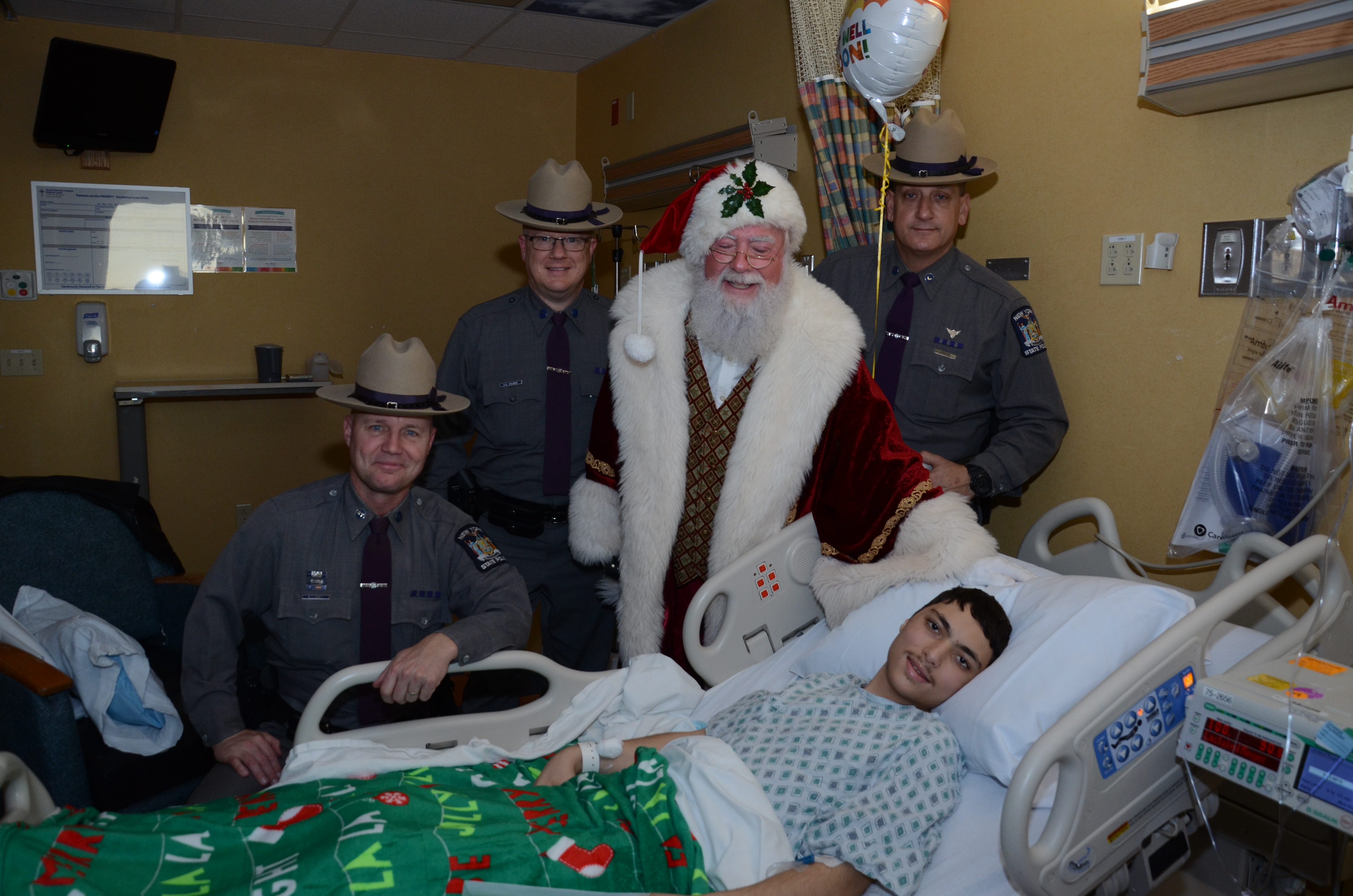 Trooper Peter Nunziata (Troop L PBA Delegate), Trooper William Knapp, and Trooper Daniel Ahlgrim (Troop L Public Information Officer), joined Dan Regini (Troopers Memorial Fund President) and Good Sam Hospital Pediatric Unit Staff in helping that jolly old guy Santa bring some smiles to the unit.