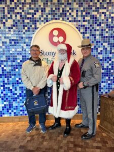 Our efforts to bring a cheer during the holidays to hospitalized children continued in 2019 with a visit with Santa to the newly opened Children’s Hospital on the campus of SUNY Stony Brook. Joining us were uniformed members Trooper Pete Nunziata, TMF Trustee and Troop L PBA Delegate and Trooper William Knapp.